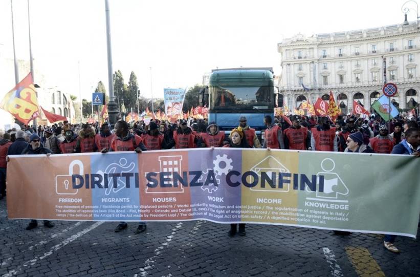 16日下午3时左右,由上百个工会和协会组织的“权利无国界”游行在罗马的共和国广场(piazza della Repubblica)集合。游行队伍提出“给没有国际保护的难民发放人道主义居留”的诉求,并要求政府提供足够的住房和其它合法权利。