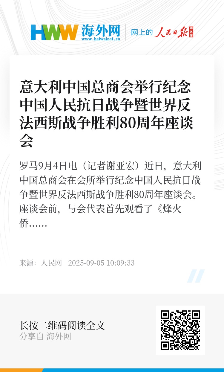人民网罗马9月4日电(记者谢亚宏)近日,意大利中国总商会在会所举行纪念中国人民抗日战争暨世界反法西斯战争胜利80周年座谈会。座谈会前,与会代表首先观看了《烽火侨心》纪念抗战胜利宣传片。