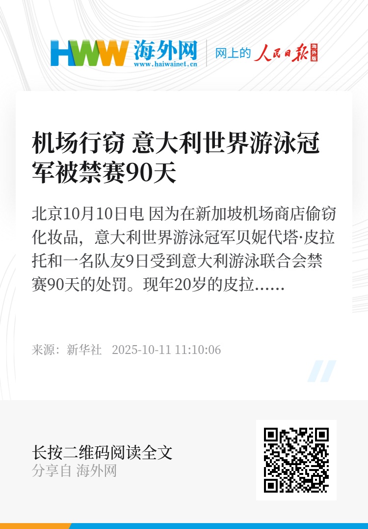 新华社北京10月10日电 因为在新加坡机场商店偷窃化妆品,意大利世界游泳冠军贝妮代塔·皮拉托和一名队友9日受到意大利游泳联合会禁赛90天的处罚。