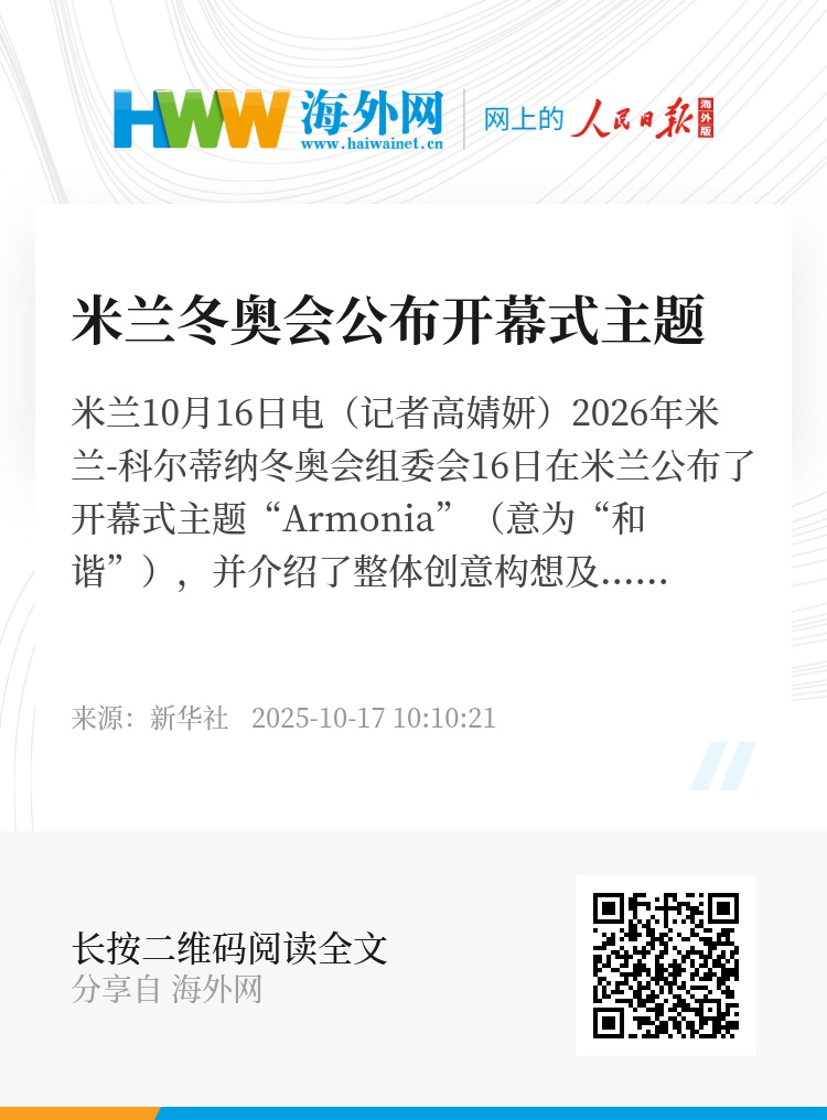 新华社米兰10月16日电(记者高婧妍)2026年米兰-科尔蒂纳冬奥会组委会16日在米兰公布了开幕式主题“Armonia”(意为“和谐”),并介绍了整体创意构想及首批参与人员。