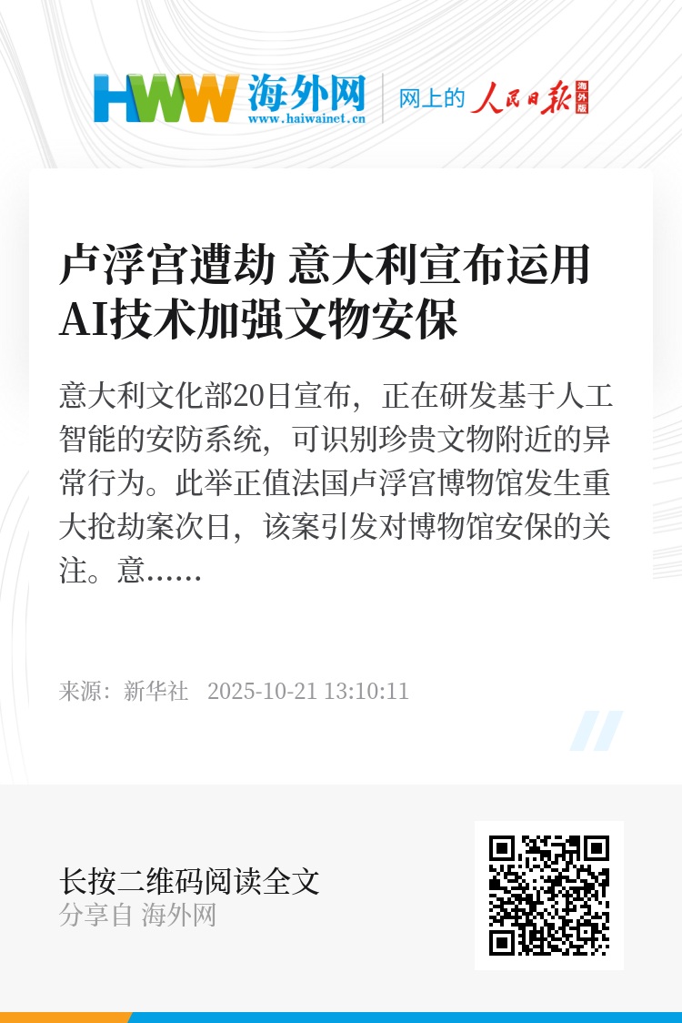 意大利文化部20日宣布,正在研发基于人工智能的安防系统,可识别珍贵文物附近的异常行为。此举正值法国卢浮宫博物馆发生重大抢劫案次日,该案引发对博物馆安保的关注。
