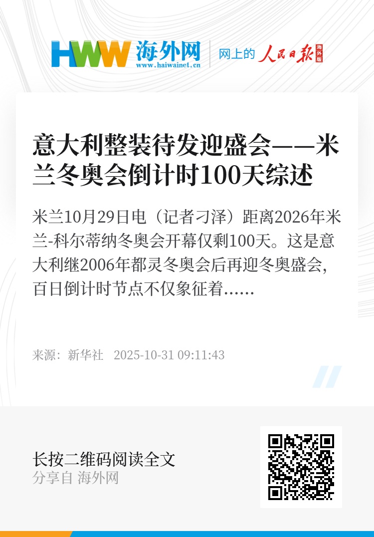 新华社米兰10月29日电(记者刁泽)距离2026年米兰-科尔蒂纳冬奥会开幕仅剩100天。这是意大利继2006年都灵冬奥会后再迎冬奥盛会,百日倒计时节点不仅象征着筹备工作进入冲刺阶段,也唤起了意大利社会各界对“冰雪之约”的热切期盼。