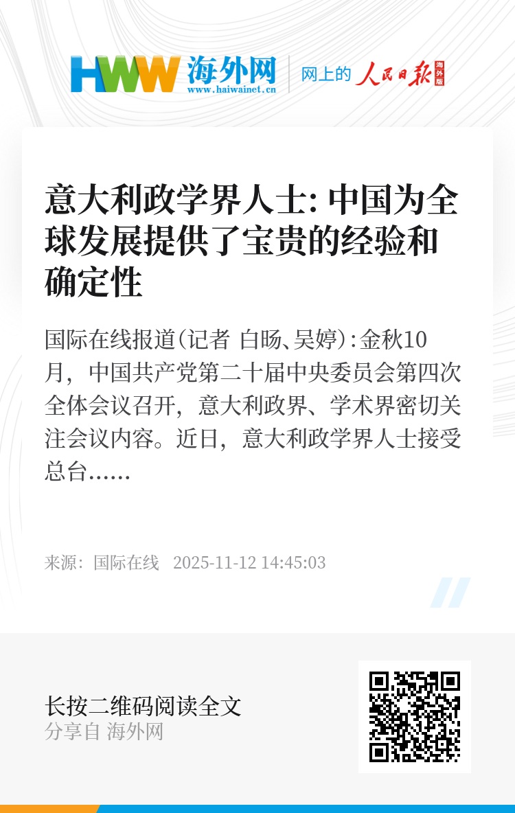 国际在线报道(记者 白旸、吴婷):金秋10月,中国共产党第二十届中央委员会第四次全体会议召开,意大利政界、学术界密切关注会议内容。近日,意大利政学界人士接受总台意大利语部专访,他们表示本次全会和审议通过的“十五五”规划建议是中国将战略与实践紧密结合的又一次体现。中国五年规划通过其战略稳定性和政策连续性,为动荡中的世界经济提供了宝贵的经验和确定性。