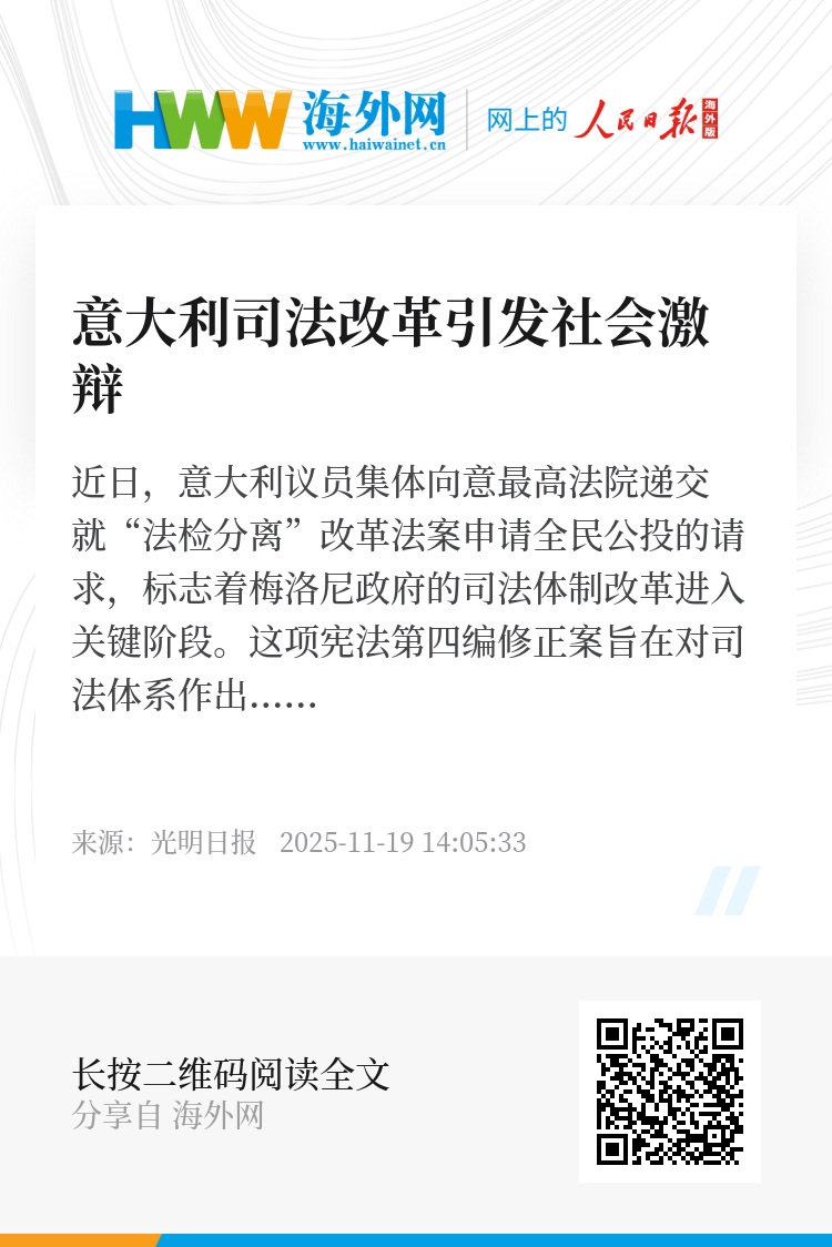 此前,意大利议会已完成对该法案的最终表决。由于未获三分之二多数支持,在得到最高法院确认后,法案将通过全民公投进行最终表决。若支持票数量高于反对票,法案即可正式生效。目前,这场涉及司法独立与权力制衡的争议在意大利已进入白热化阶段。