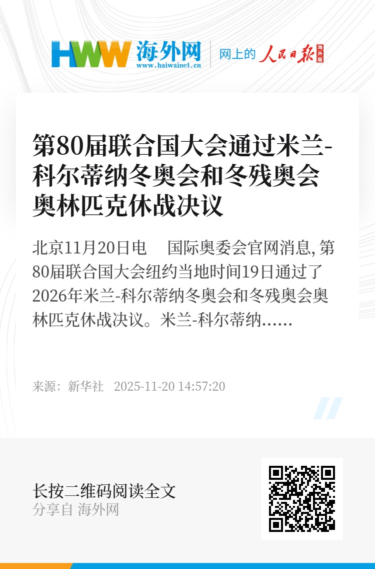 新华社北京11月20日电 国际奥委会官网消息,第80届联合国大会纽约当地时间19日通过了2026年米兰-科尔蒂纳冬奥会和冬残奥会奥林匹克休战决议。