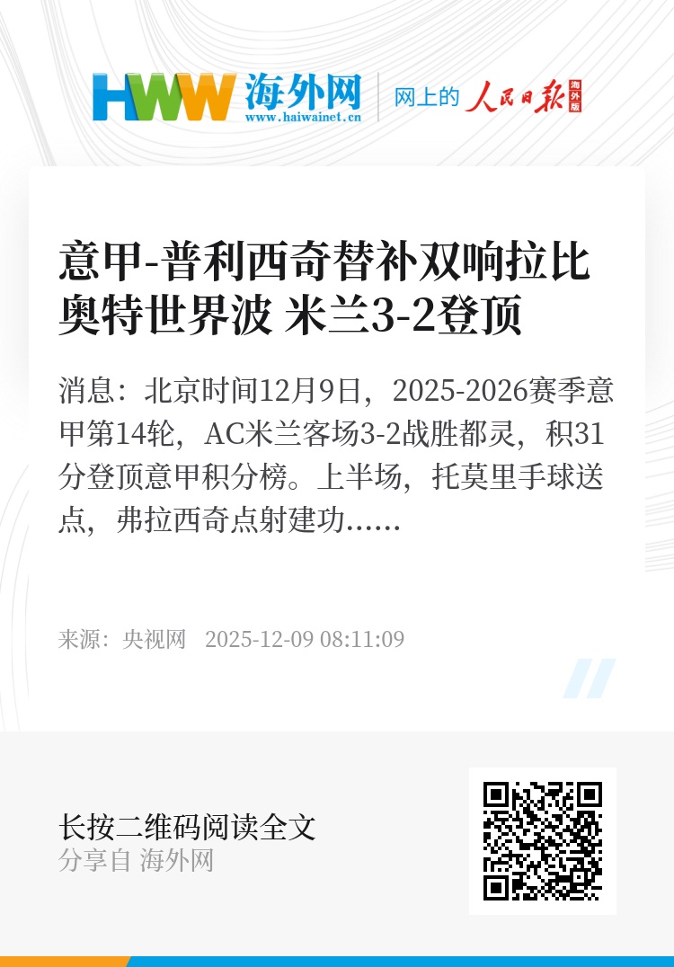 央视网消息:北京时间12月9日,2025-2026赛季意甲第14轮,AC米兰客场3-2战胜都灵,积31分登顶意甲积分榜。