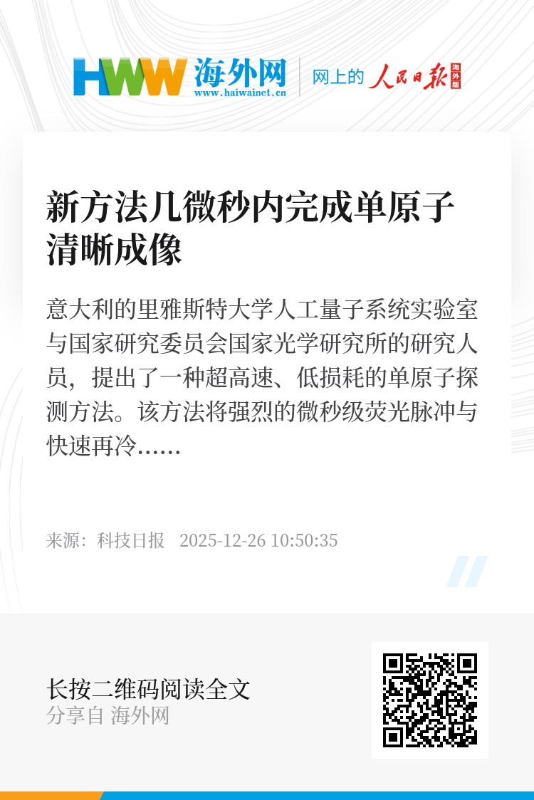 意大利的里雅斯特大学人工量子系统实验室与国家研究委员会国家光学研究所的研究人员,提出了一种超高速、低损耗的单原子探测方法。该方法将强烈的微秒级荧光脉冲与快速再冷却相结合,在几微秒内即可获得清晰的单原子成像,同时还能让超过99.5%的原子仍保留在光学陷阱中,并可重复使用,将单原子成像性能推进到新的水平。相关论文发表在最新一期《量子科学与技术》和《物理评论快报》杂志上。