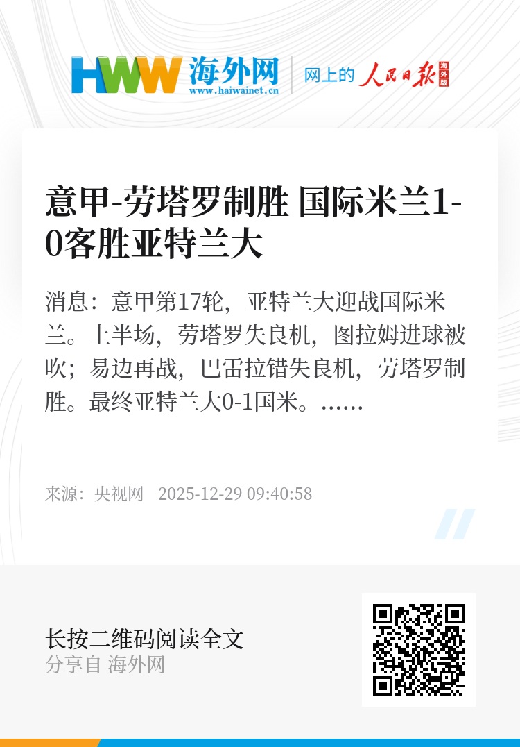 央视网消息:意甲第17轮,亚特兰大迎战国际米兰。上半场,劳塔罗失良机,图拉姆进球被吹;易边再战,巴雷拉错失良机,劳塔罗制胜。最终亚特兰大0-1国米。