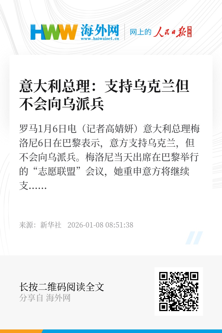 新华社罗马1月6日电(记者高婧妍)意大利总理梅洛尼6日在巴黎表示,意方支持乌克兰,但不会向乌派兵。