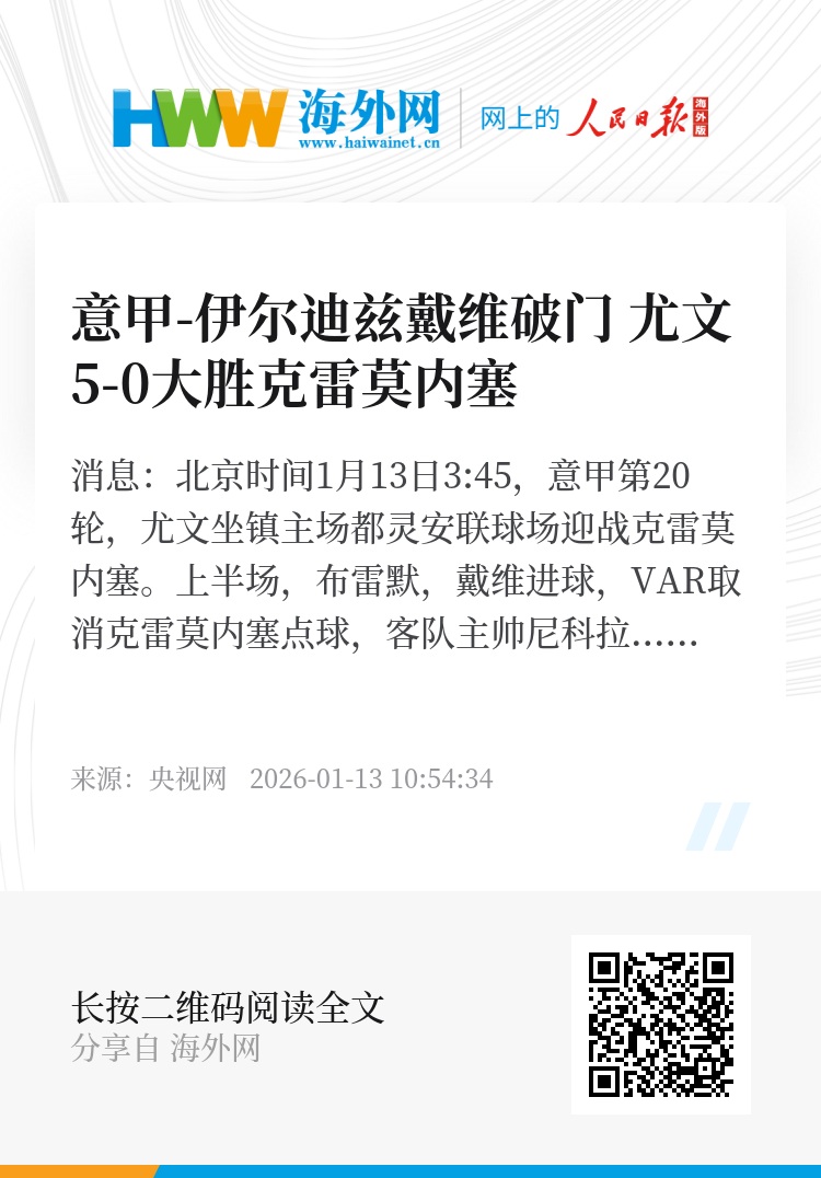 央视网消息:北京时间1月13日3:45,意甲第20轮,尤文坐镇主场都灵安联球场迎战克雷莫内塞。上半场,布雷默,戴维进球,VAR取消克雷莫内塞点球,客队主帅尼科拉不满判罚连续吃牌被罚下,伊尔迪兹失点自己补射命中,易边再战,麦肯尼造泰拉恰诺乌龙后头槌破门。最终,尤文5-0大胜克雷莫内塞。积分榜方面,尤文39分追平罗马,克雷莫内塞22分排名第13。
