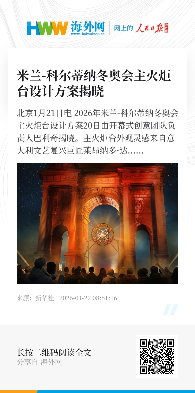 新华社北京1月21日电 2026年米兰-科尔蒂纳冬奥会主火炬台设计方案20日由开幕式创意团队负责人巴利奇揭晓。主火炬台外观灵感来自意大利文艺复兴巨匠莱昂纳多·达·芬奇绘制的几何绳结图案。其结构采用可变几何设计,闭合时直径为3.1米,展开时可达到4.5米。