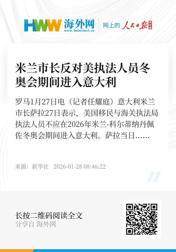 新华社罗马1月27日电(记者任耀庭)意大利米兰市长萨拉27日表示,美国移民与海关执法局执法人员不应在2026年米兰-科尔蒂纳丹佩佐冬奥会期间进入意大利。