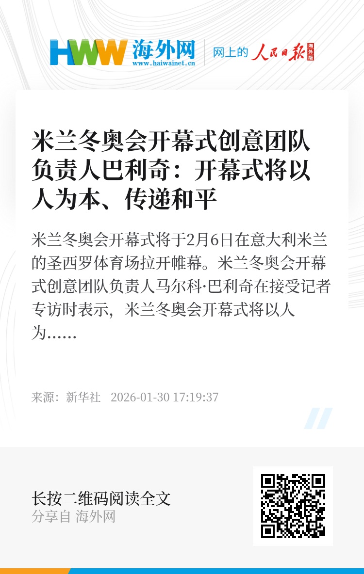 米兰冬奥会开幕式将于2月6日在意大利米兰的圣西罗体育场拉开帷幕。米兰冬奥会开幕式创意团队负责人马尔科·巴利奇在接受新华社记者专访时表示,米兰冬奥会开幕式将以人为本、传递和平。