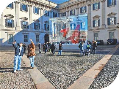 在米兰市中心的大教堂广场上,当地市民在奥运宣传展板前自拍。
