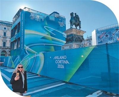 米兰市民与游客在冬奥会倒计时装置前拍照合影。