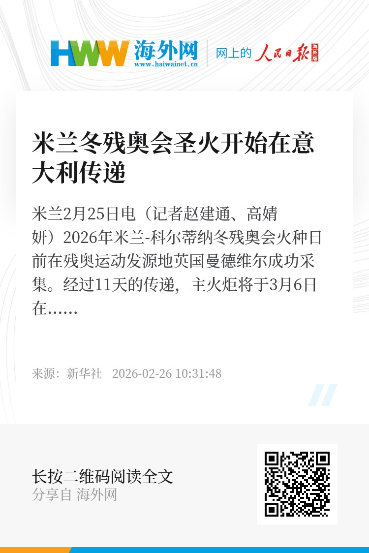 新华社米兰2月25日电(记者赵建通、高婧妍)2026年米兰-科尔蒂纳冬残奥会火种日前在残奥运动发源地英国曼德维尔成功采集。经过11天的传递,主火炬将于3月6日在维罗纳竞技场举行的开幕式上点燃。