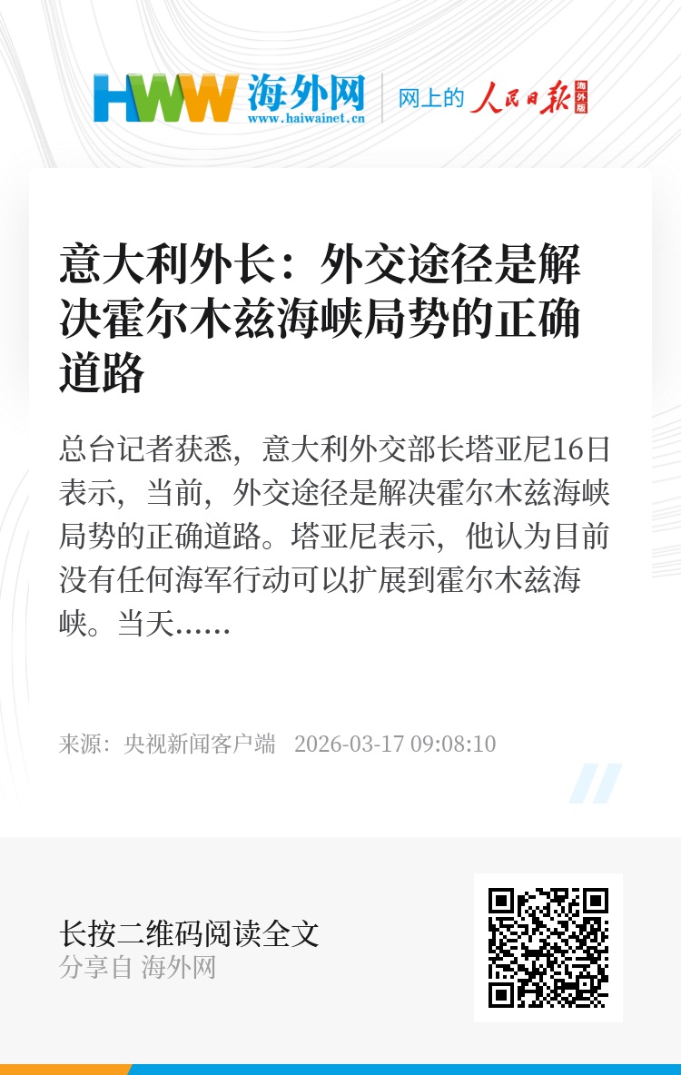 总台记者获悉,意大利外交部长塔亚尼16日表示,当前,外交途径是解决霍尔木兹海峡局势的正确道路。塔亚尼表示,他认为目前没有任何海军行动可以扩展到霍尔木兹海峡。