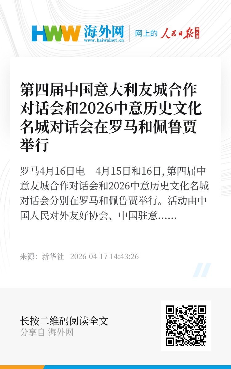 新华社罗马4月16日电 4月15日和16日,第四届中意友城合作对话会和2026中意历史文化名城对话会分别在罗马和佩鲁贾举行。活动由中国人民对外友好协会、中国驻意使馆、意城市协会、意议会“中国之友”协会、意中文化交流协会和佩鲁贾省政府共同主办。