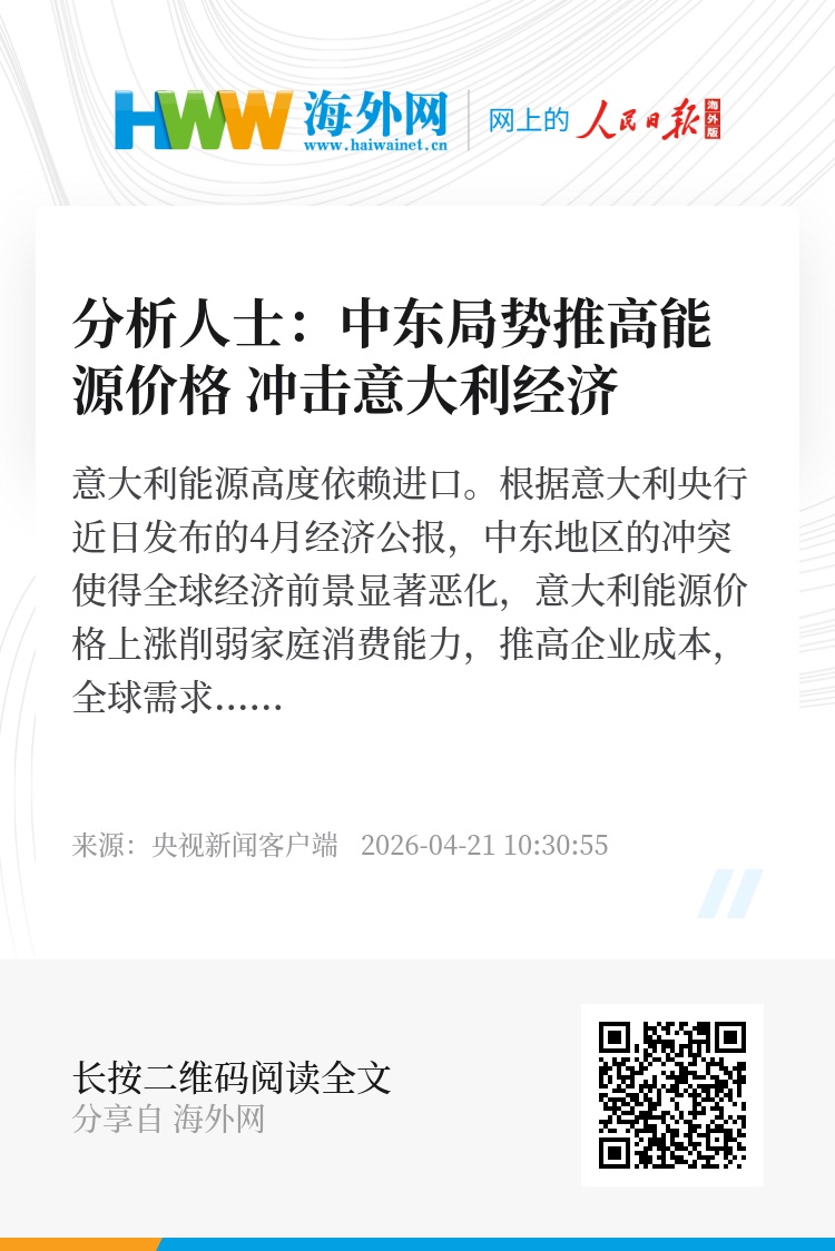 意大利能源高度依赖进口。根据意大利央行近日发布的4月经济公报,中东地区的冲突使得全球经济前景显著恶化,意大利能源价格上涨削弱家庭消费能力,推高企业成本,全球需求走弱也对意大利出口构成压力。