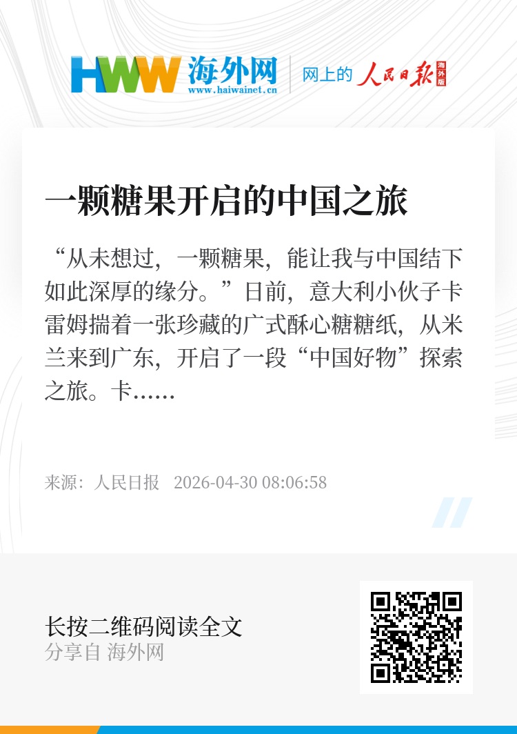 “从未想过,一颗糖果,能让我与中国结下如此深厚的缘分。”日前,意大利小伙子卡雷姆揣着一张珍藏的广式酥心糖糖纸,从米兰来到广东,开启了一段“中国好物”探索之旅。